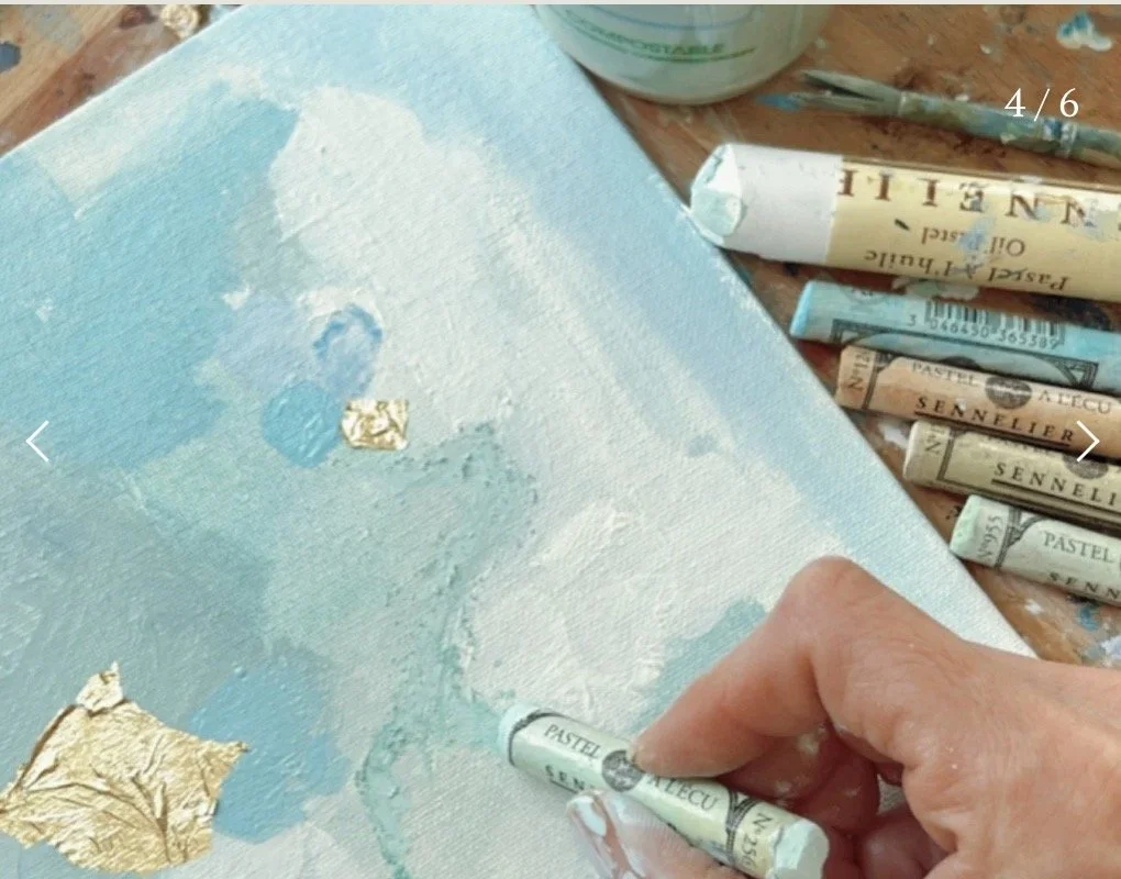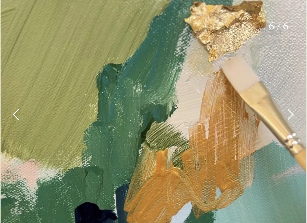 Come join me for an inspiring spring abstract painting class.. We will be painting a pretty composition using greens, blues, whites and golds with hints of other colors too. We will use acrylic paints, gold leaf, and oil pastel. I will be gently guiding you step by step, but also encouraging a unique personal result. All supplies are provided, including an apron and an easel to take home. Sign up with a friend or come on your own!