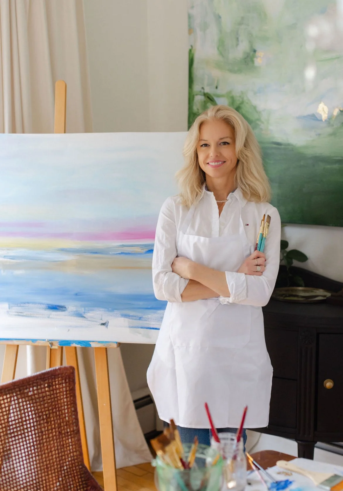 Easels, aprons, and all necessary studio supplies.